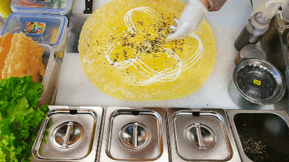 集顏值、營(yíng)養(yǎng)與口味于一身,噴香的餅皮上刷上獨(dú)門秘制醬料